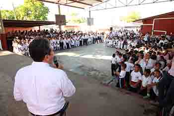 Durante su primer participación en un homenaje, en la Escuela Primaria “Ignacio Manuel Altamirano” de la ranchería Buenavista Río Nuevo 3ª sección, el alcalde Evaristo Hernández Cruz anunció esta mañana el regreso del programa “Niños de 10”, el inicio de la construcción de 300 aulas nuevas, 100 baños, techados de plazas cívicas, becas mensuales de 500 pesos para los mejores estudiantes del nivel básico del municipio y revisiones médicas de la vista y oídos a infantes.