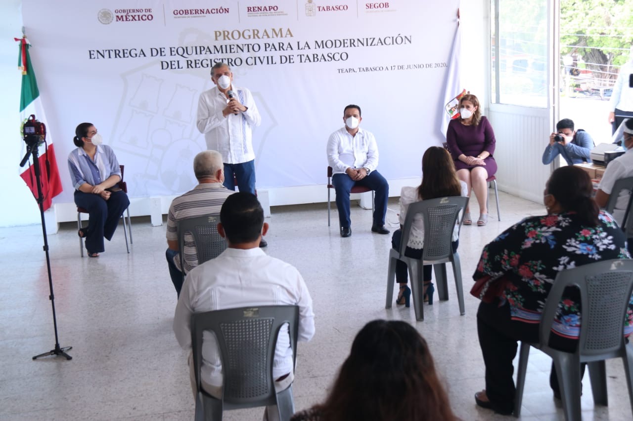 Con total apego a las normas sanitarias y de sana distancia, el gobernador Adán Augusto López Hernández visitó este miércoles el municipio de Teapa para entregar equipos de cómputo del Programa de Modernización del Registro Civil de Tabasco.