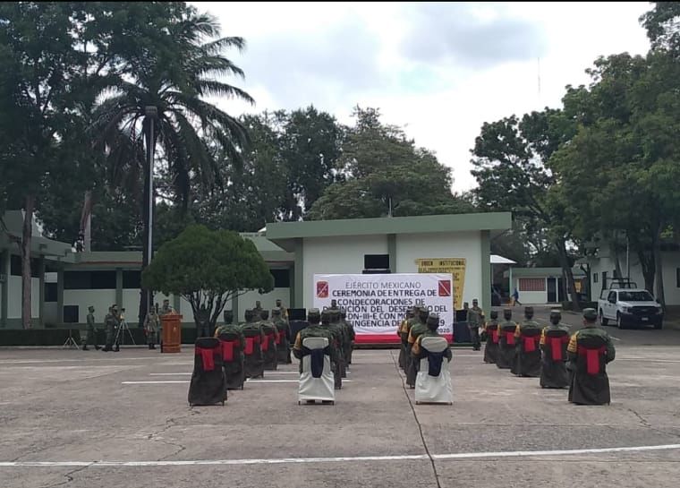 La Secretaría de la Defensa Nacional (Sedena), expuso que, con fundamento en el artículo 31 de la Ley de Ascensos y Recompensas del Ejército y Fuerza Aérea Mexicanos, se llevó a cabo en las instalaciones del 37/o. Batallón de Infantería la ceremonia de entrega de Condecoración de Distinción del Desempeño del Plan DN-III-E, al personal adscrito a la 30 Zona Militar, que se encuentra participando directamente en la contingencia sanitaria generada por el COVID-19, en Tabasco.