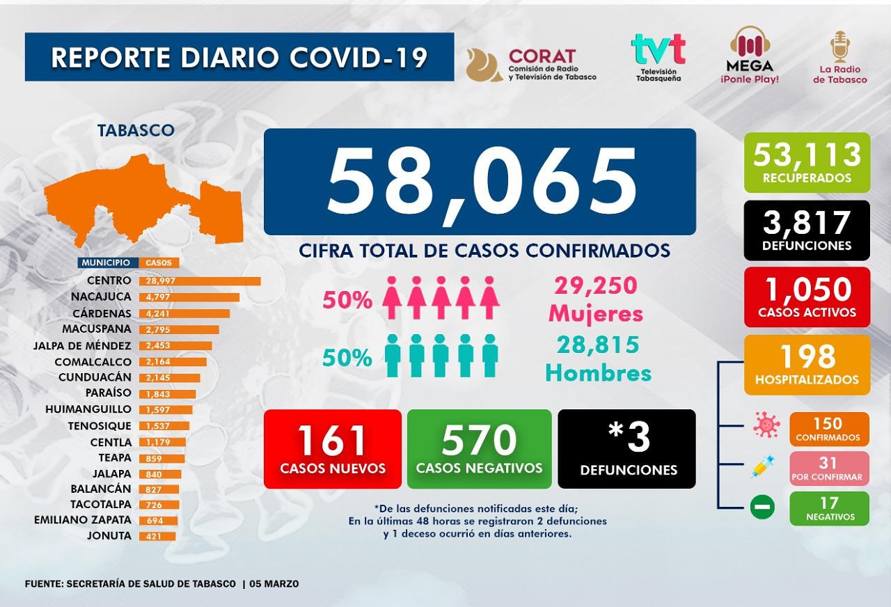 De acuerdo al Comunicado Técnico Diario, Tabasco registra 58 mil 65 casos confirmados y 3 mil 817 fallecimientos por SARS-CoV-2, así como 53 mil 113 pacientes recuperados, mil 50 activos y 198 pacientes hospitalizados, de los cuales, 130 resultaron positivos, 31 esperan resultados y 17 salieron negativos.