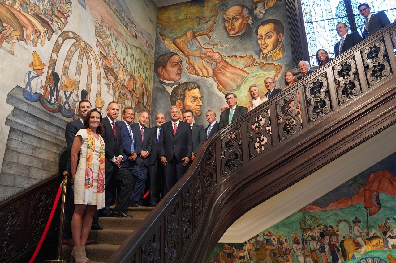El Jefe del Ejecutivo se tomó una fotografía en el mural que pintó el artista poblano Roberto Cueva del Río, con los empresarios Carlos Slim Helú, el presidente del CCE, Francisco Cervantes; el embajador de Estados Unidos en México, Ken Salazar y empresarios estadounidenses.