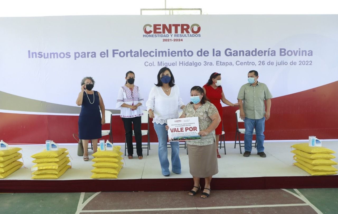 En apoyo a familias de 59 localidades de Centro, la alcaldesa Yolanda Osuna Huerta, entregó 200 paquetes productivos del programa Insumos para el Fortalecimiento de la Ganadería Bovina, a favor de igual número de productores, en ceremonia realizada en la colonia Miguel Hidalgo III Etapa.