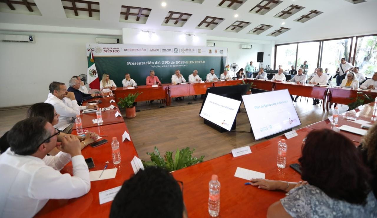 El secretario de Gobernación, Adán Augusto López Hernández, acompañado por el subsecretario de Prevención y Promoción de la Salud, Hugo López-Gatell Ramírez; y los directores generales del Instituto Mexicano del Seguro Social (IMSS), Zoé Robledo Aburto; y del Instituto de Seguridad y Servicios Sociales de los Trabajadores del Estado (Issste), Pedro Zenteno Santaella, así como el gobernador Nayarit, Miguel Ángel Navarro Quintero, presentaron el proyecto de decreto que creará el Organismo Público Descentralizado (OPD), IMSS-Bienestar, como parte de las acciones para la transformación de los servicios estatales de salud.
