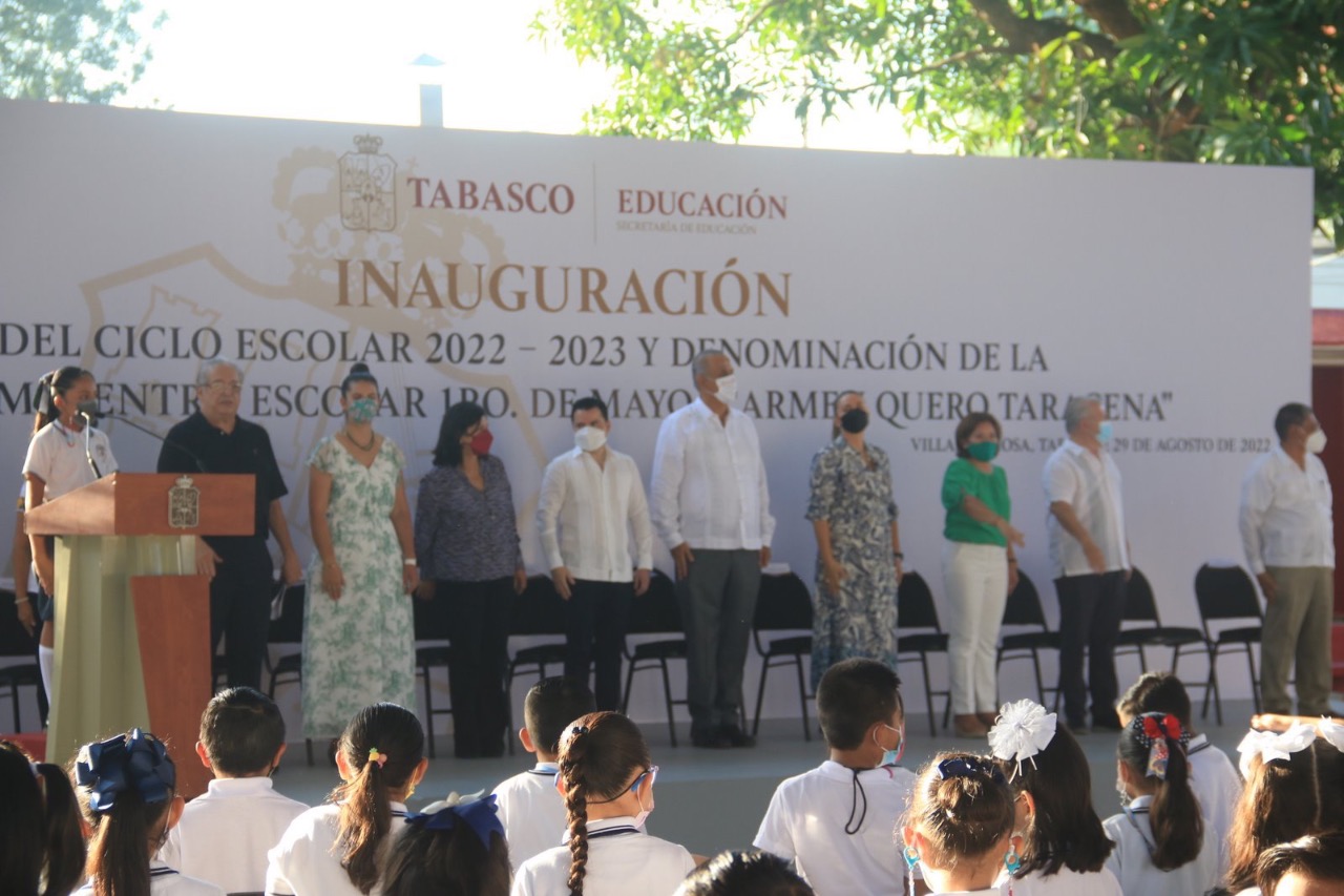 El gobernador Carlos Manuel Merino Campos puso en marcha el inicio del ciclo escolar 2022-2023 acompañado de su esposa Guadalupe Castro de Merino, así como de la alcaldesa de Centro Yolanda Osuna Huerta y la secretaria de Educación, Egla Cornelio Landero, además del presidente de la Jucopo del Congreso del Estado, Jaime Humberto Lastra Bastar y el presidente de la mesa directiva del Congreso local, Emilio Martínez de Escobar.
