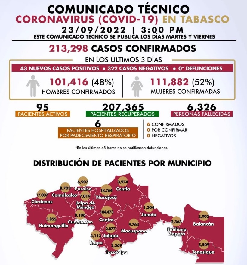 En cuanto al COVID-19 por municipios, 104 mil 473 registra el municipio de Centro; le sigue Cárdenas con 17 mil 007; Nacajuca con 18 mil 764; Macuspana con 9 mil 763; Comalcalco con 8 mil 703; Jalpa de Méndez con 7 mil 019;Cunduacán 8 mil 106;Paraíso con 6 mil 907;Huimanguillo 5 mil 855; Tenosique 5 mil 509;Centla con 3 mil 974; Teapa con 4 mil 113; Balancán 3 mil 992; Jalapa con 2 mil 877; Tacotalpa 2 mil 569; Emiliano Zapata 2 mil 363;Jonuta con 1 mil 304 casos.