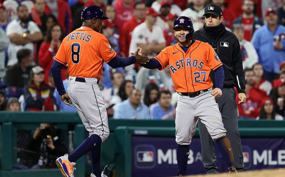 El venezolano José Altuve aprovechó un pésimo fildeo por parte de Rhys Hoskins y conectó la tercera carrera de la noche para los Astros.