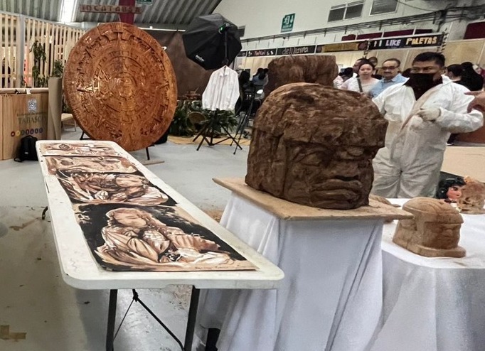 Uno de los principales atractivos del Festival del Chocolate 2022 y con el que propios y extraños no perdieron oportunidad de tomarse fotografías, fue la obra en chocolate esculpida por el artesano tabasqueño Santiago García Méndez, originario de la villa Ignacio Allende del municipio de Centla.