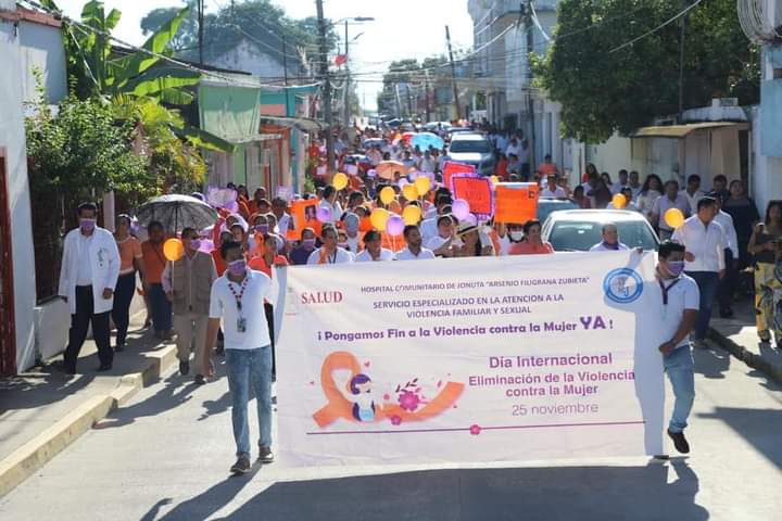 JONUTA, TAB.- Mujeres jonutecas, autoridades del municipio y de salud participaron en caminata y magistral conferencia para conmemorar el Día Internacional de la no Violencia contra las femeninas.