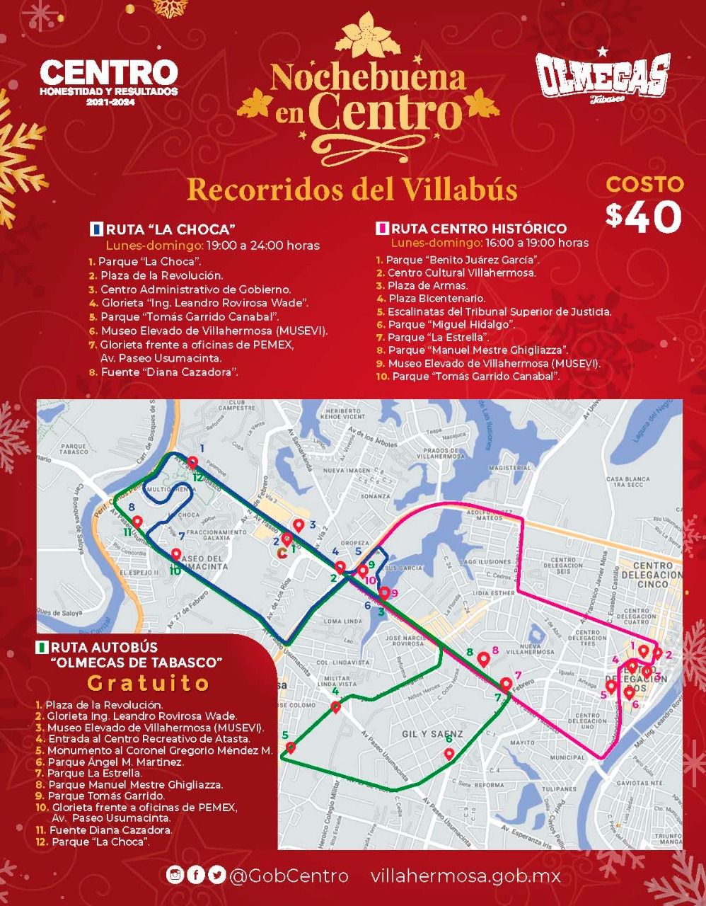 De igual manera, habrá viajes en el Villabús los cuales tendrá un costo simbólico de 40 pesos por persona, con recorridos en 2 rutas y con puntos de salida de los parques “La Choca” y “Benito Juárez García”. La Dirección de Fomento Económico y Turismo, a cargo de Emmanuel Martínez Patraca, comunicó que uno de los propósitos de “Nochebuena en Centro” es propiciar la convivencia familiar, así como la opción de regocijarse en los espacios públicos; además de conservar nuestras tradiciones que tanto alegran y emocionan a las familias. Durante los recorridos las personas admirarán diversas temáticas de nacimientos navideños, bellezas elaboradas por artesanos tabasqueños de manera magistral y plasmadas en diversos escenarios, resplandeciendo con luces de multicolores y música navideña.