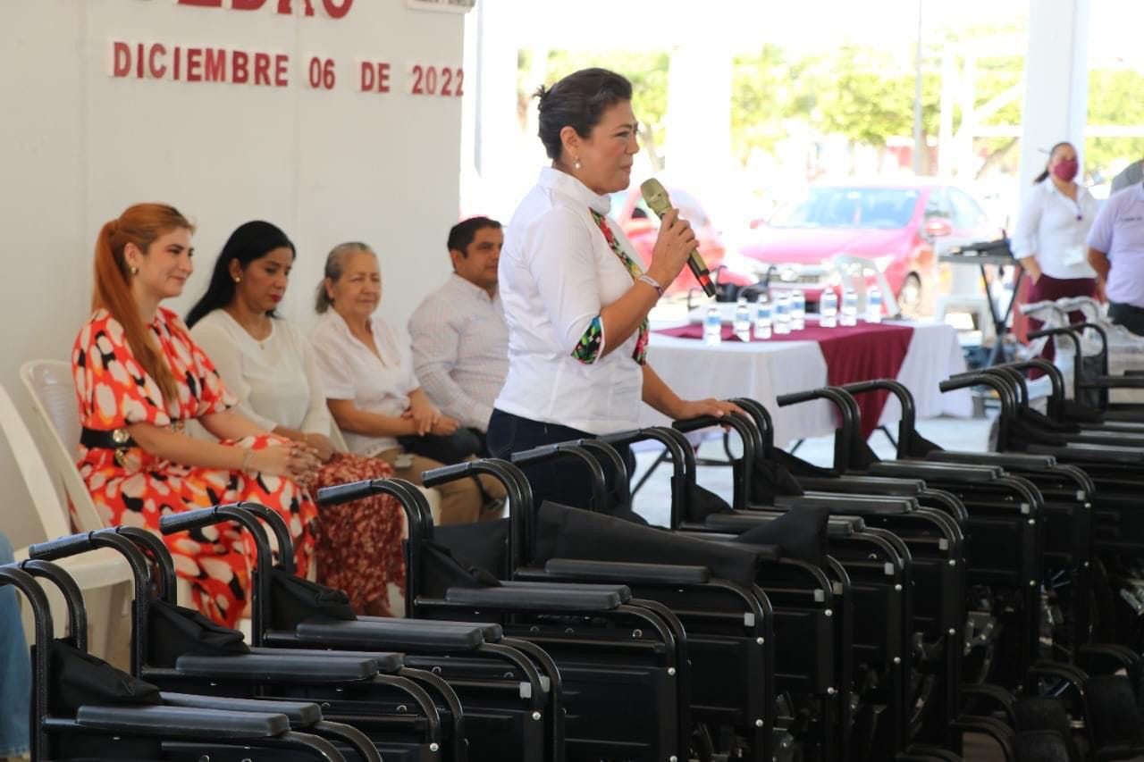 En el Domo de la Unidad Deportiva, la alcaldesa destacó que, este es el segundo paquete de sillas de rueda que el Gobierno de Cárdenas entrega este año, llegando a un total de 150, al tiempo de reconocer el arduo trabajo de la directora del DIF, Irene Vera de Dios, de la presidenta del Sistema DIF, Maythé Paloma Yris Zapata, y de todo el personal en general de la dependencia. Reconoció también el respaldo de la Beneficencia Pública del DIF Estatal, para acciones de este tipo, tanto en la gestión de la Sra. Dea Isabel Estrada de López, como de la Sra. Guadalupe Castro de Merino, quienes siempre han dado su mano amiga a las causas nobles del pueblo de Cárdenas.