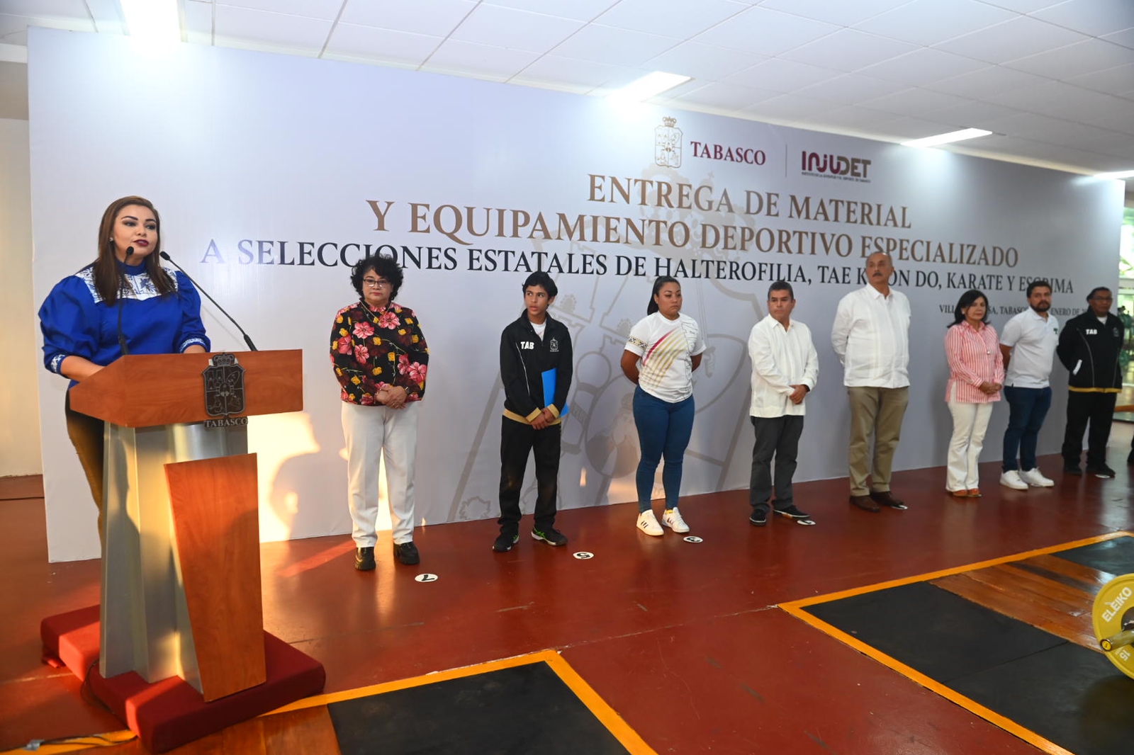 El mandatario entregó este jueves materiales y equipamiento deportivo especializado por más de 1.5 millones de pesos a atletas tabasqueños que forman parte de las selecciones de halterofilia, tae kwon do, karate y esgrima, mismos que representarán a Tabasco en las competencias convocadas este 2023 por la Comisión Nacional de Cultura Física y Deporte (CONADE). Aseveró que hoy en la entidad existe un gobierno consciente de las carencias heredadas que tienen que enfrentar día a día jóvenes y entrenadores.