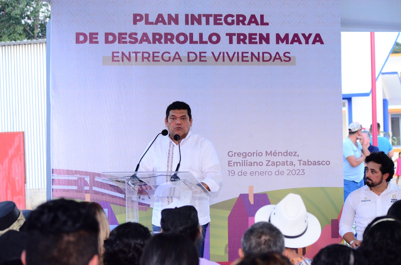 EMILIANO ZAPATA, TAB.- El director general de Fonatur, Javier May Rodríguez hizo entrega de las primeras 20 viviendas a familias que estaban asentadas en zonas denominadas derechos de vía, por donde va a transitar el Tren Maya en el poblado Gregorio Méndez Magaña (Pénjamo) de Emiliano Zapata.