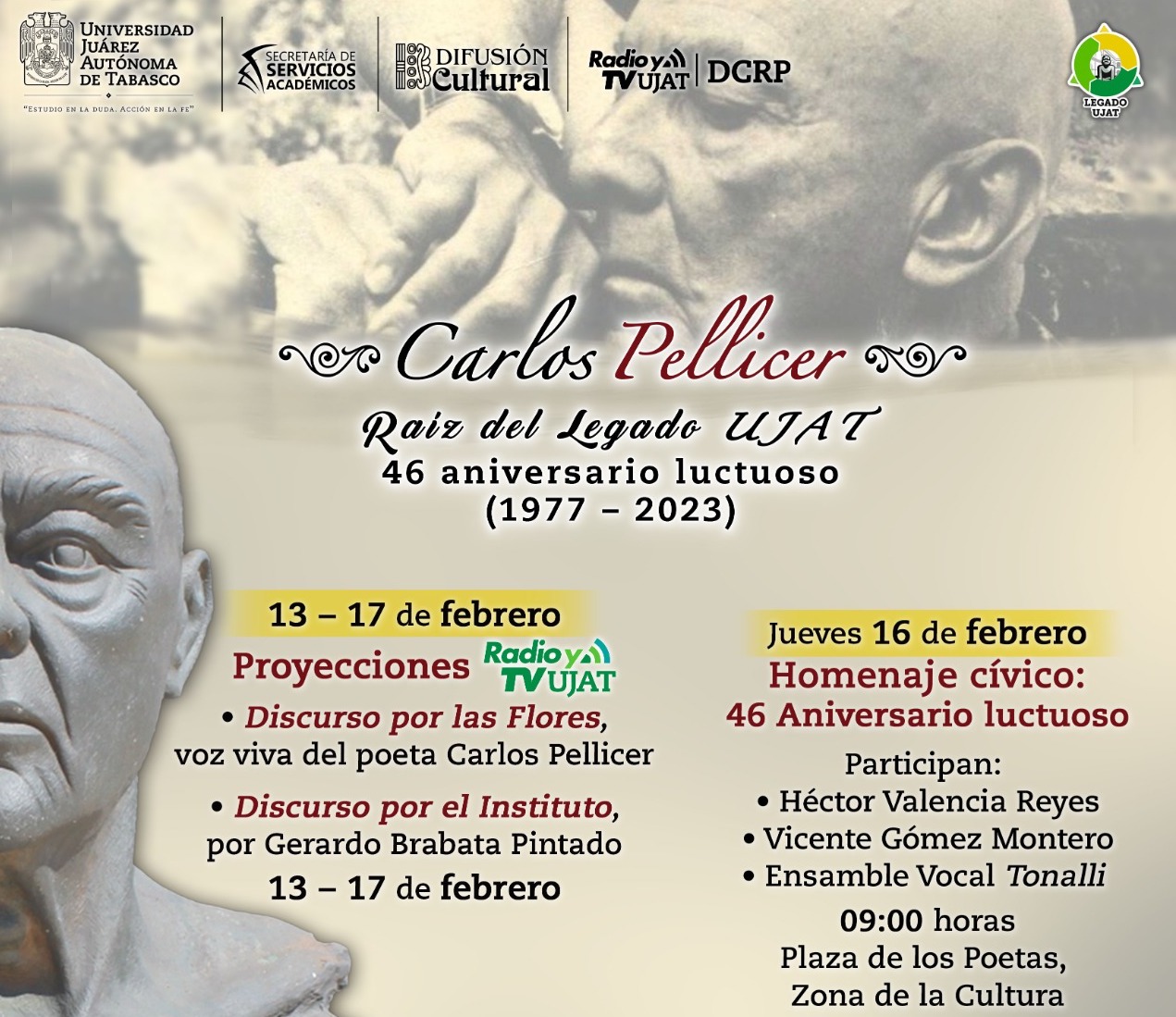 En el marco del 49 aniversario luctuoso del ilustre tabasqueño y poeta Carlos Pellicer, la Universidad Juárez Autónoma de Tabasco (UJAT), realiza un homenaje póstumo, del 13 al 17 de febrero.