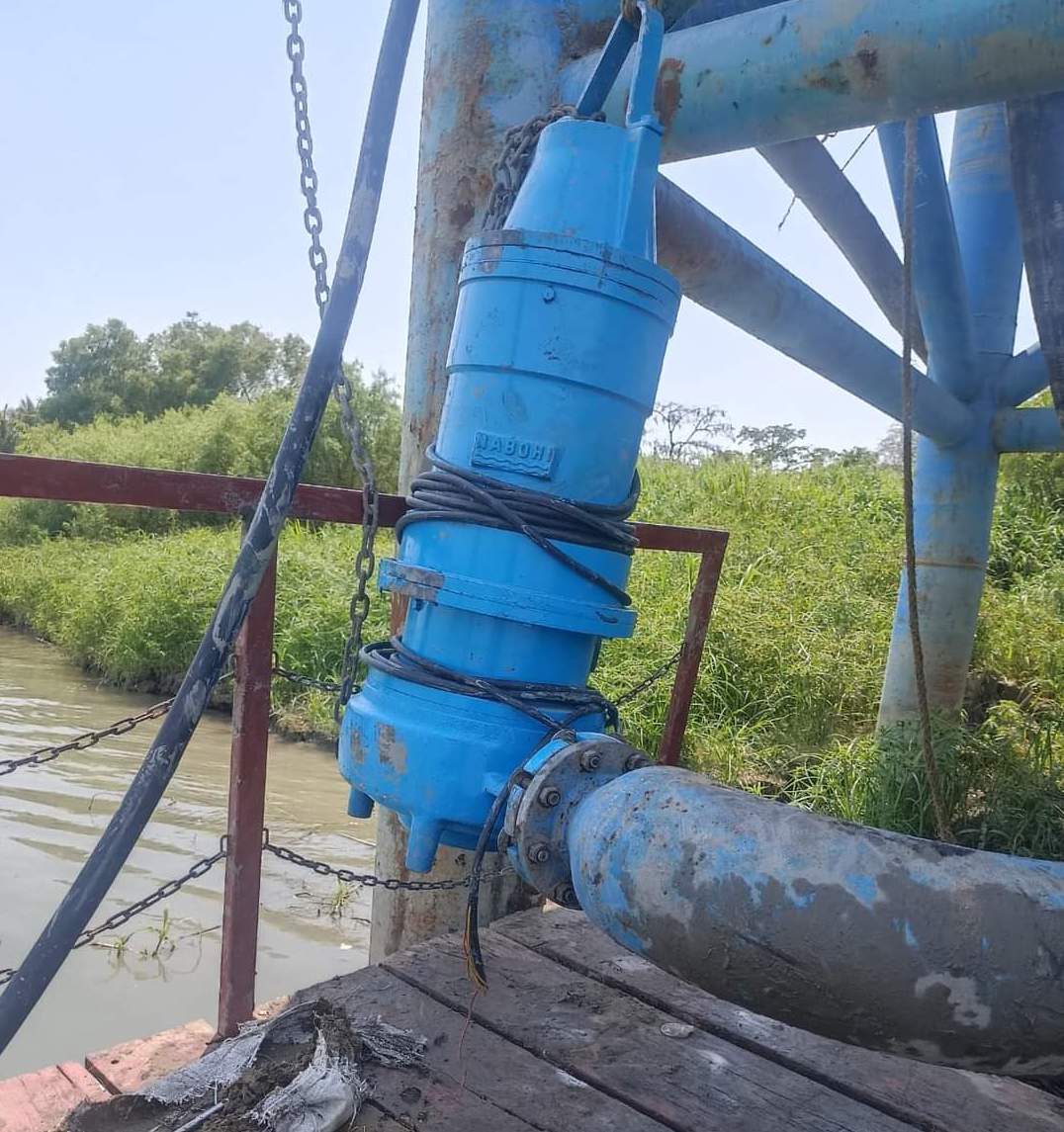 Por lo que hasta el momento trabaja una bomba que la cuidamos para que no se rompa, por eso decidido pararla a partir de las nueve de la noche y la poneos en funcionamiento a las 6 de la mañana hasta las 20:00 horas cada día y la solución al problema sería que se coloque a tubería, la bomba que esta sobre la plataforma mas afuera del río donde esté más profundo”.