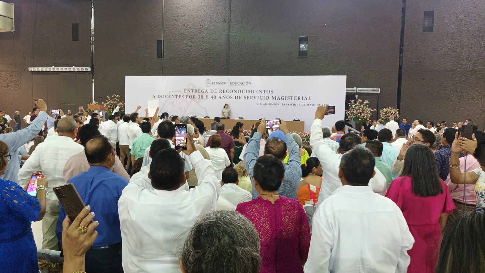 En el marco de la celebración del Día del Maestro docentes galardonados por 30 y 40 años de servicio, le reclamaron al gobernador Carlos Manuel Merino Campos, y a las autoridades educativas, el descuento de casi 25 mil pesos del bono que recibieron por su trayectoria.