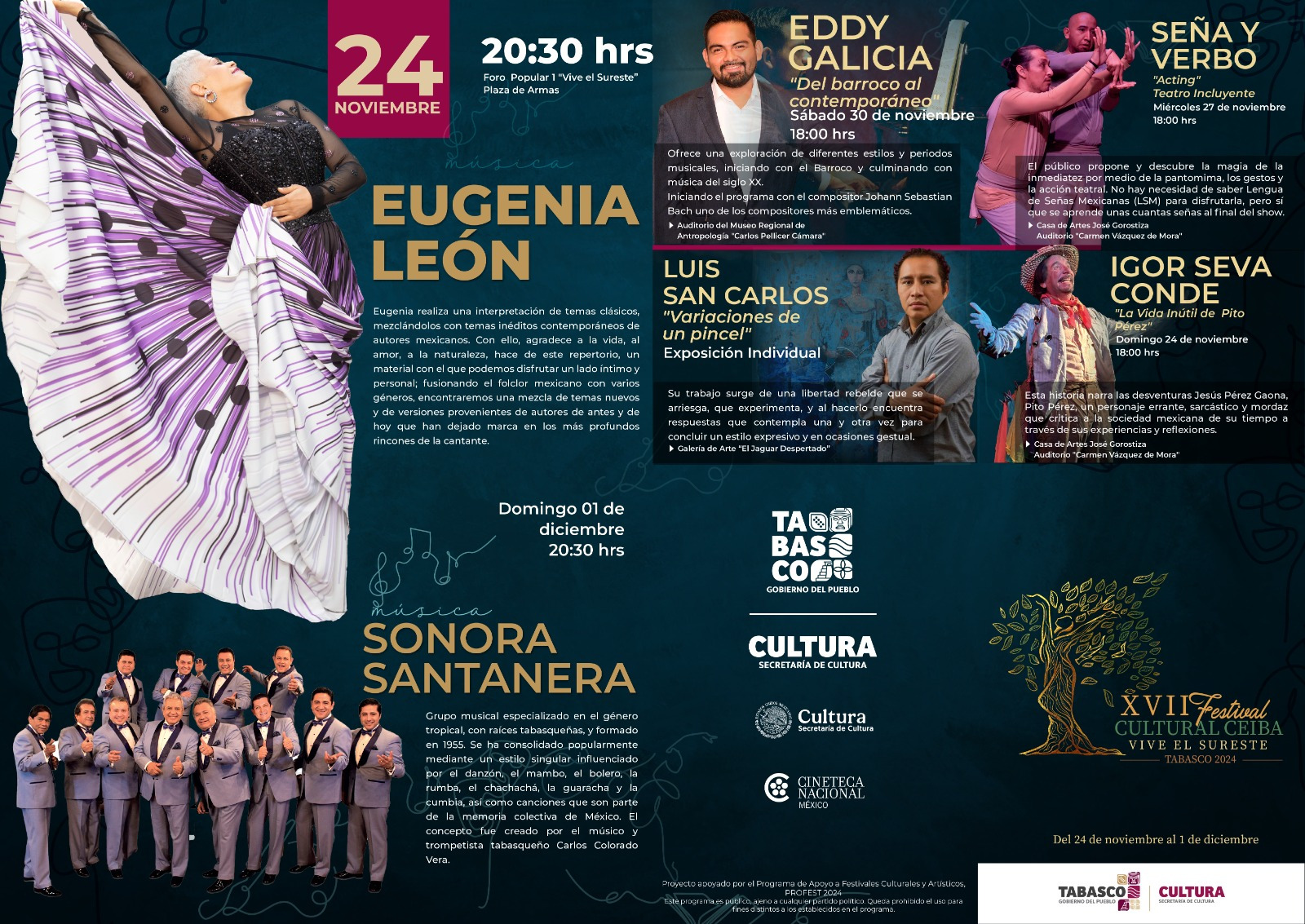El XVII Festival Cultural Ceiba Tabasco 2024 “Vive el Sureste” se llevará a cabo del 24 de noviembre al 1 de diciembre en diversos escenarios del estado en la que se ofrecerá ocho intensos días de actividades, con 640 artistas y 70 eventos en 16 foros.