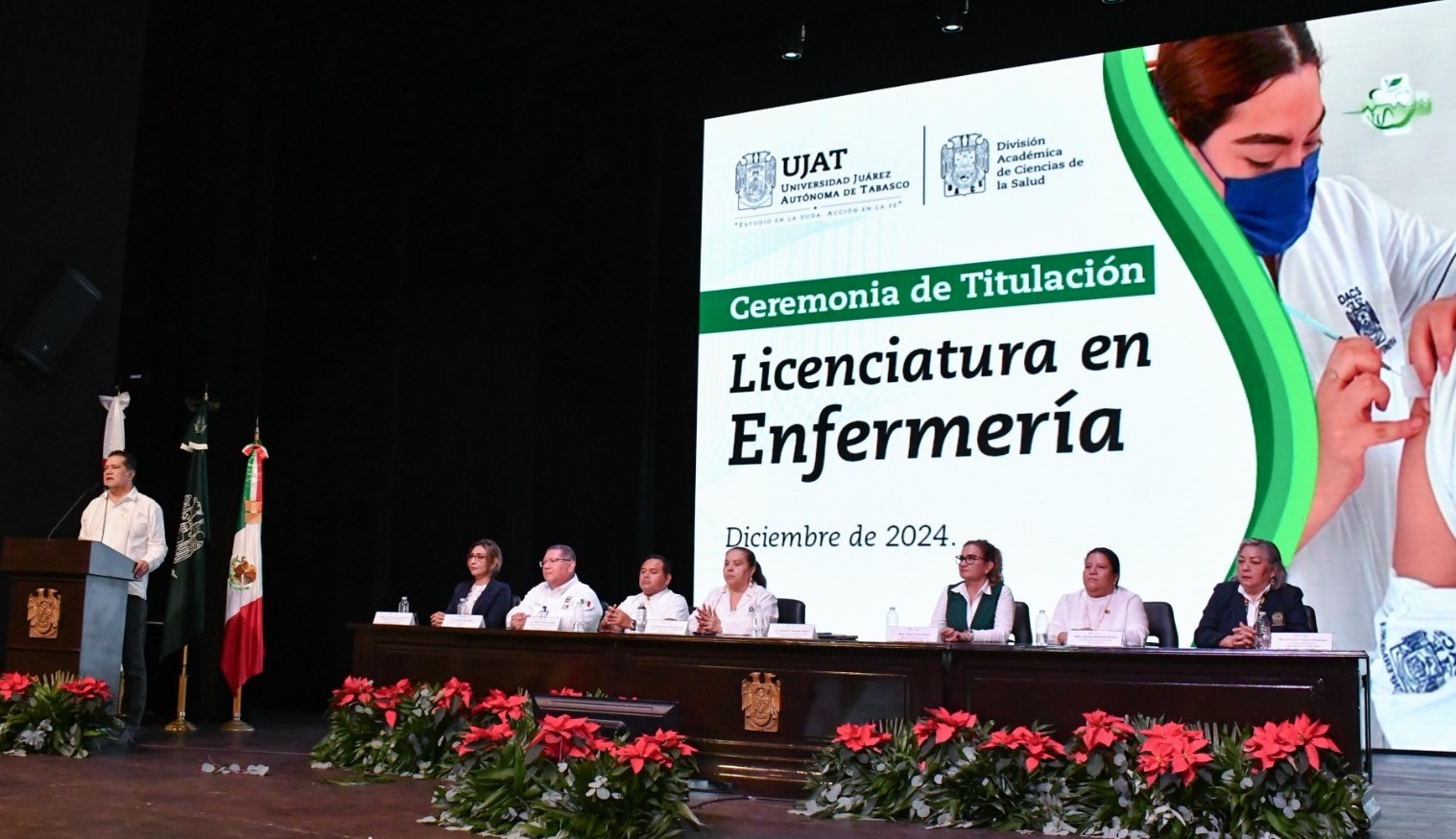 “Hoy la máxima casa de estudios, egresa una generación de más de 100 licenciados en enfermería, que se incorporan a la vida productiva y social del estado de Tabasco y del mundo”, remarcó Narváez Osorio, ante los padres de familia, profesores y amigos de los egresados reunidos en el Teatro Universitario.