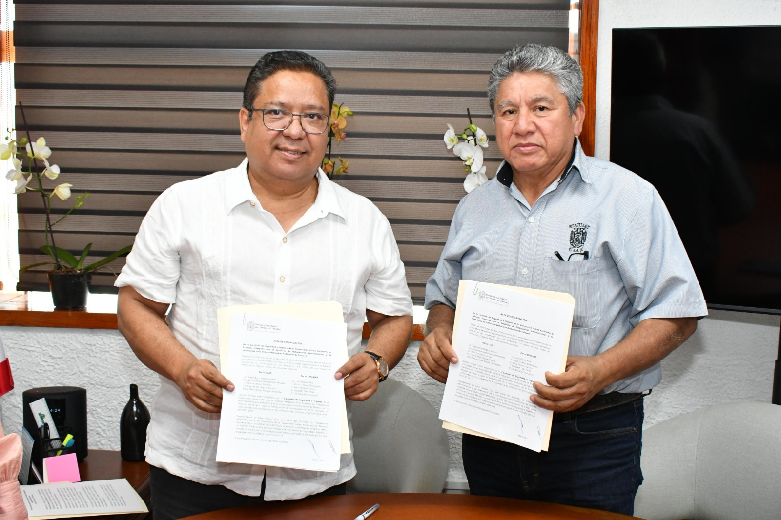 Con la finalidad de preservar la integridad física y mental de todos los trabajadores universitarios y promover un entorno laboral libre de riesgos, se llevó a cabo la firma del Acta de Actualización de la Comisión de Seguridad e Higiene del Sindicato de Trabajadores Administrativos y de Intendencia de la Universidad Juárez Autónoma de Tabasco (STAIUJAT).