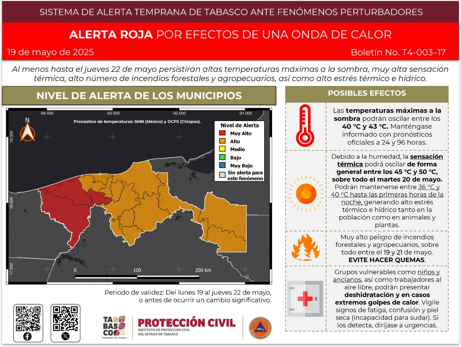 Estas precipitaciones contribuirían a disminuir las altas sensaciones térmicas, ya que desde este lunes hasta el miércoles 21 de mayo se estima que se registren las mayores sensaciones térmicas de la actual onda de calor, alcanzando entre 46 °C y 50 °C, especialmente en la región de la Chontalpa.
