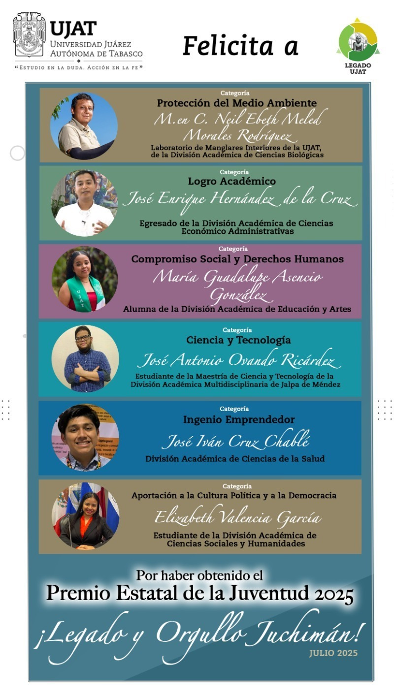 Por su talento, liderazgo y compromiso social en diversas áreas clave para el desarrollo de la entidad, seis estudiantes y egresados de la Universidad Juárez Autónoma de Tabasco (UJAT) obtuvieron el Premio Estatal de la Juventud 2025 que otorga el Instituto de la Juventud y el Deporte de Tabasco (INJUDET), en colaboración con la Secretaría de Educación Pública del gobierno del Estado de Tabasco.