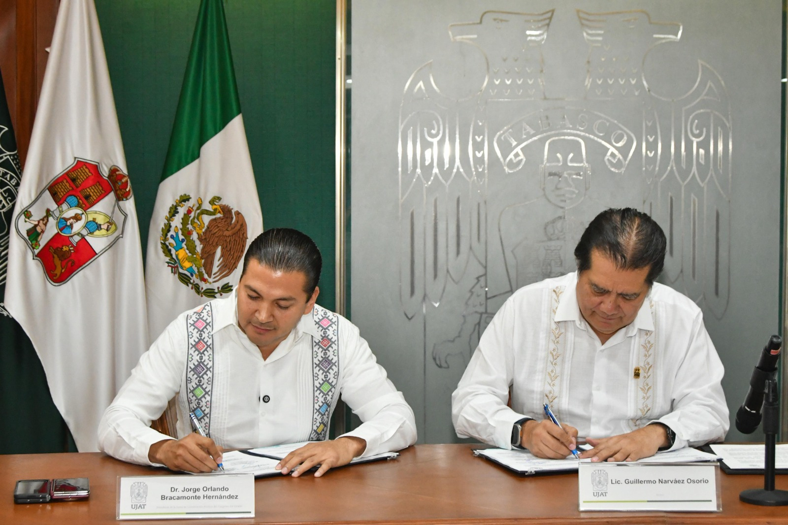 A través del servicio social y la práctica profesional, la Universidad Juárez Autónoma de Tabasco (UJAT), asume el compromiso de poner a disposición del Poder Legislativo, todo el talento y capacidad de los jóvenes universitarios, aseguró el rector Guillermo Narváez Osorio, al firmar un convenio de colaboración con el presidente de la Junta de Coordinación Política del Congreso del Estado, Jorge Orlando Bracamonte Hernández.