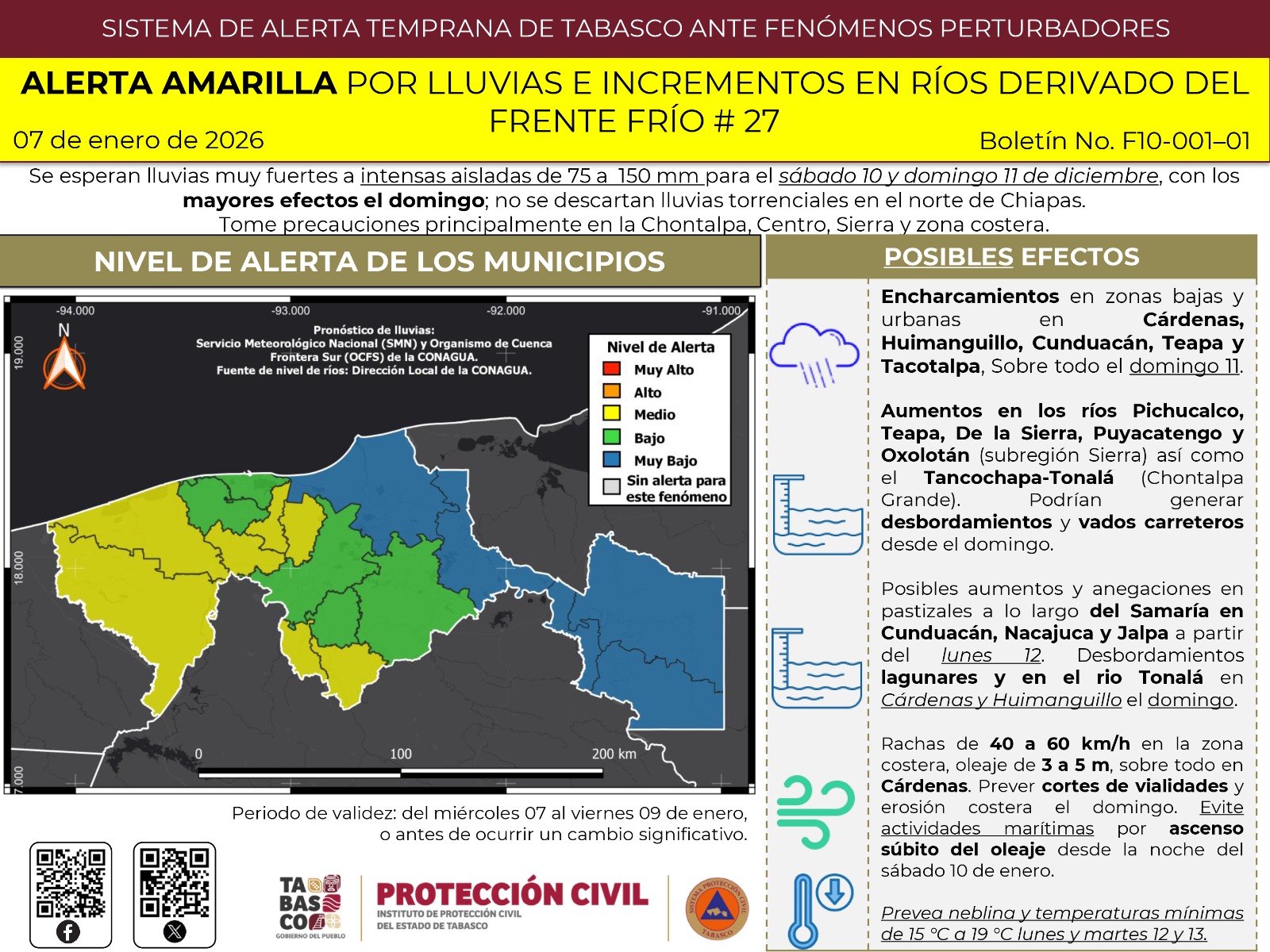 El Instituto de Protección Civil del Estado de Tabasco (IPCET) informa la emisión de Alerta Amarilla y mantiene monitoreo permanente ante los efectos del Frente Frío número 27, el cual provocará condiciones meteorológicas adversas en la entidad.