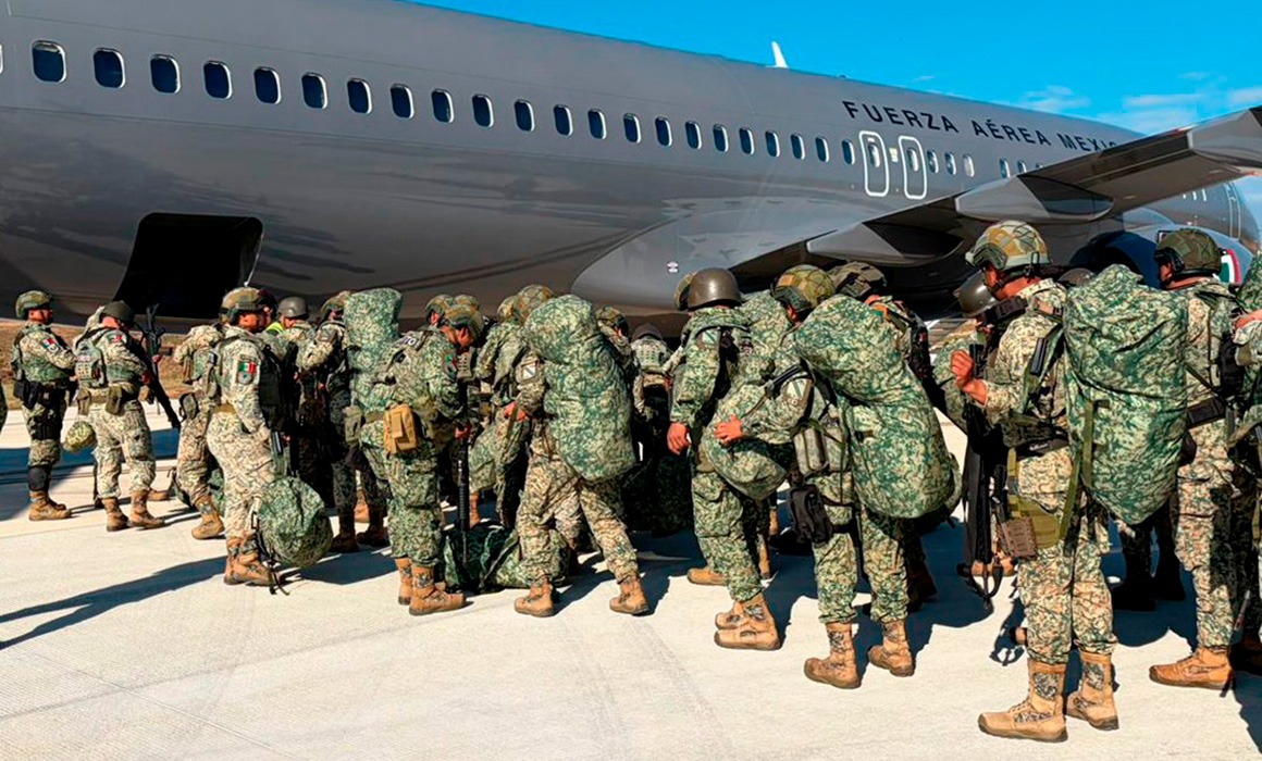 El despliegue se realizó a bordo de cuatro aeronaves de transporte pesado de la Fuerza Aérea Mexicana, con el objetivo de fortalecer las acciones operativas que mantienen la III Región Militar y la 9/a. Zona Militar en la entidad.