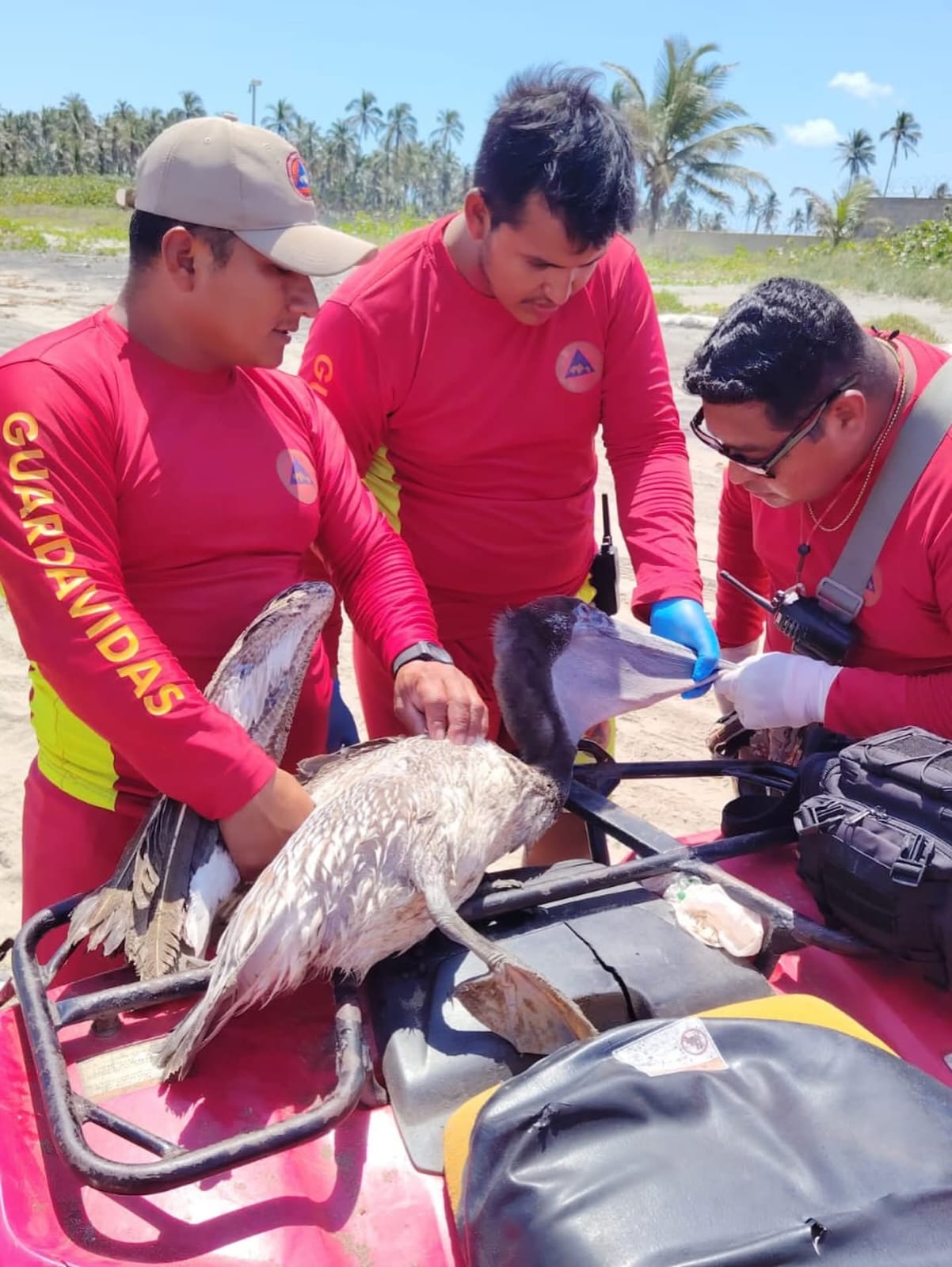 Durante un recorrido preventivo en cuatrimoto, personal del Instituto de Protección Civil, a través del CEREPAEC Costa, logró el rescate oportuno de un pelícano que se encontraba en condiciones críticas a aproximadamente un kilómetro de Playa del Sol, en el municipio de Paraíso.