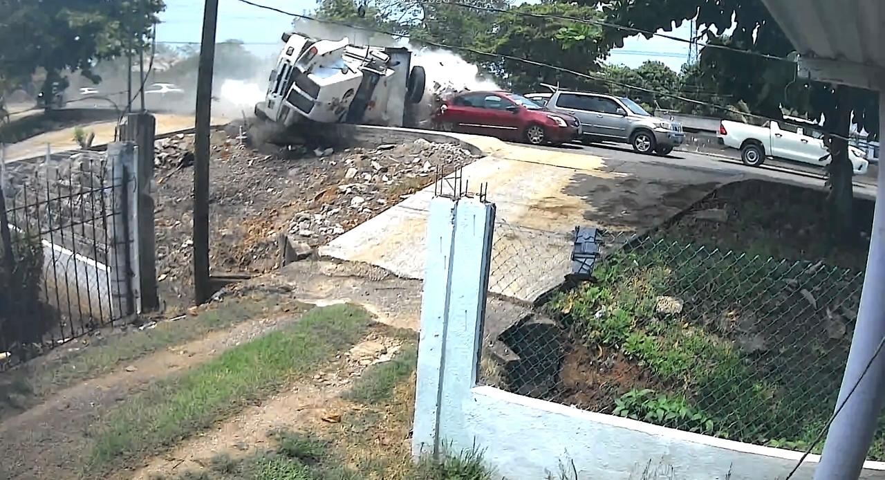 Imágenes captadas por una cámara de seguridad muestran el momento en que un automóvil frena bruscamente y derrapa, lo que habría provocado que el conductor del camión no lograra detenerse a tiempo. Tras intentar maniobrar, el operador terminó impactándose y volcando la unidad, lo que ocasionó que las rocas se dispersaran sobre la carretera, afectando a otros automovilistas.