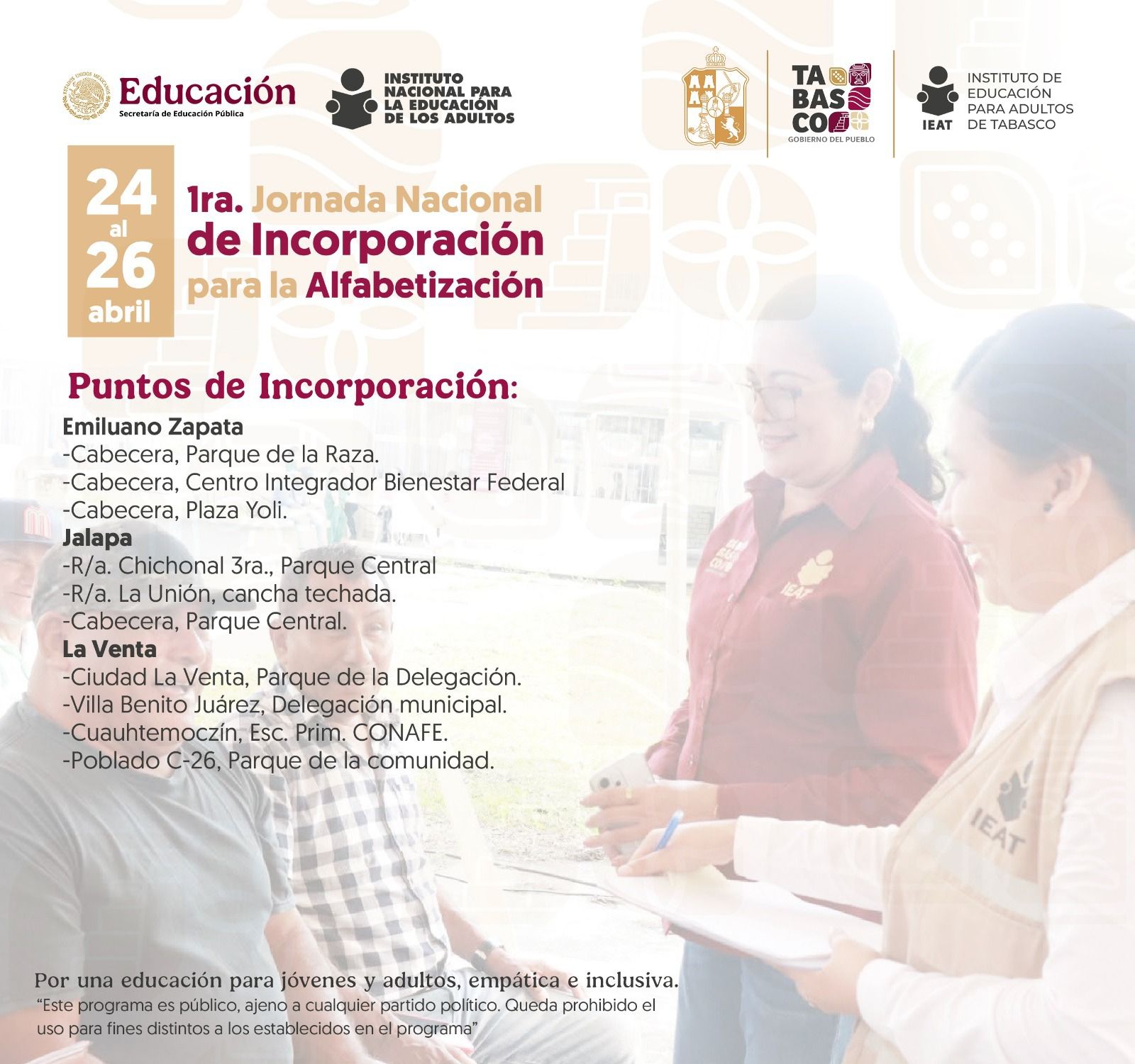 El Instituto de Educación para Adultos de Tabasco (IEAT) se sumará a la Primera Jornada Nacional de Incorporación para la Alfabetización, que se llevará a cabo del 24 al 26 de abril de 2026.